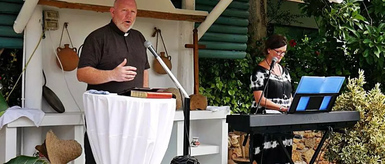 Adrian Green y su esposa dirigiendo el servicio dominical desde los terrenos del restaurante Can Truy. / redacción. eivissa