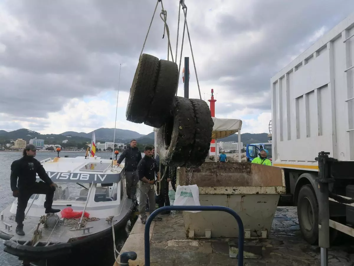 Neumáticos de diferentes tamaños, sillas, vallas, botellas, latas o materiales electrónicos... son algunos de los elementos que se sacaron ayer del fondo de la bahía de Portmany y de zonas de litoral desde la playa de s’Arenal hasta ses Coves Blanques, en la XXI edición de la fornada de limpieza ‘Sant Antoni net a fons’, que se enmarca en las fiesta patronales.