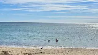Dos personas bañandose en la playa de Santa Eulària este febrero. / Marta Torres Molina