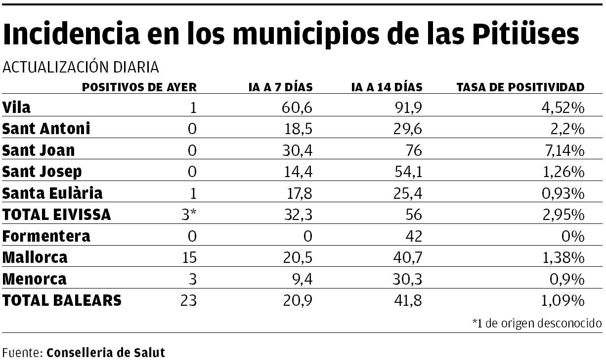 En la última semana las incidencias en Ibiza han aumentado de forma considerable. La registrada a siete días prácticamente se ha duplicado (un aumento del 99,4%) y en la contabilizada a catorce el aumento ha sido aún mayor, más del doble, un 117,9%. La isla es, además, la isla que tiene la tasa de positividad más elevada. El 2,95% de las pruebas realizadas en los últimos siete días han sido positivas.
